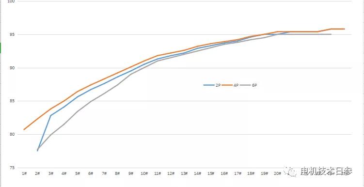 圖2直觀的描述了這一系列電機中不同極數電機效率指標的變化,即大型電機的效率優于小型電機,即大型電機的效率性能相對更容易保證,但為什么會有這個結果,這是我們交流的話題。